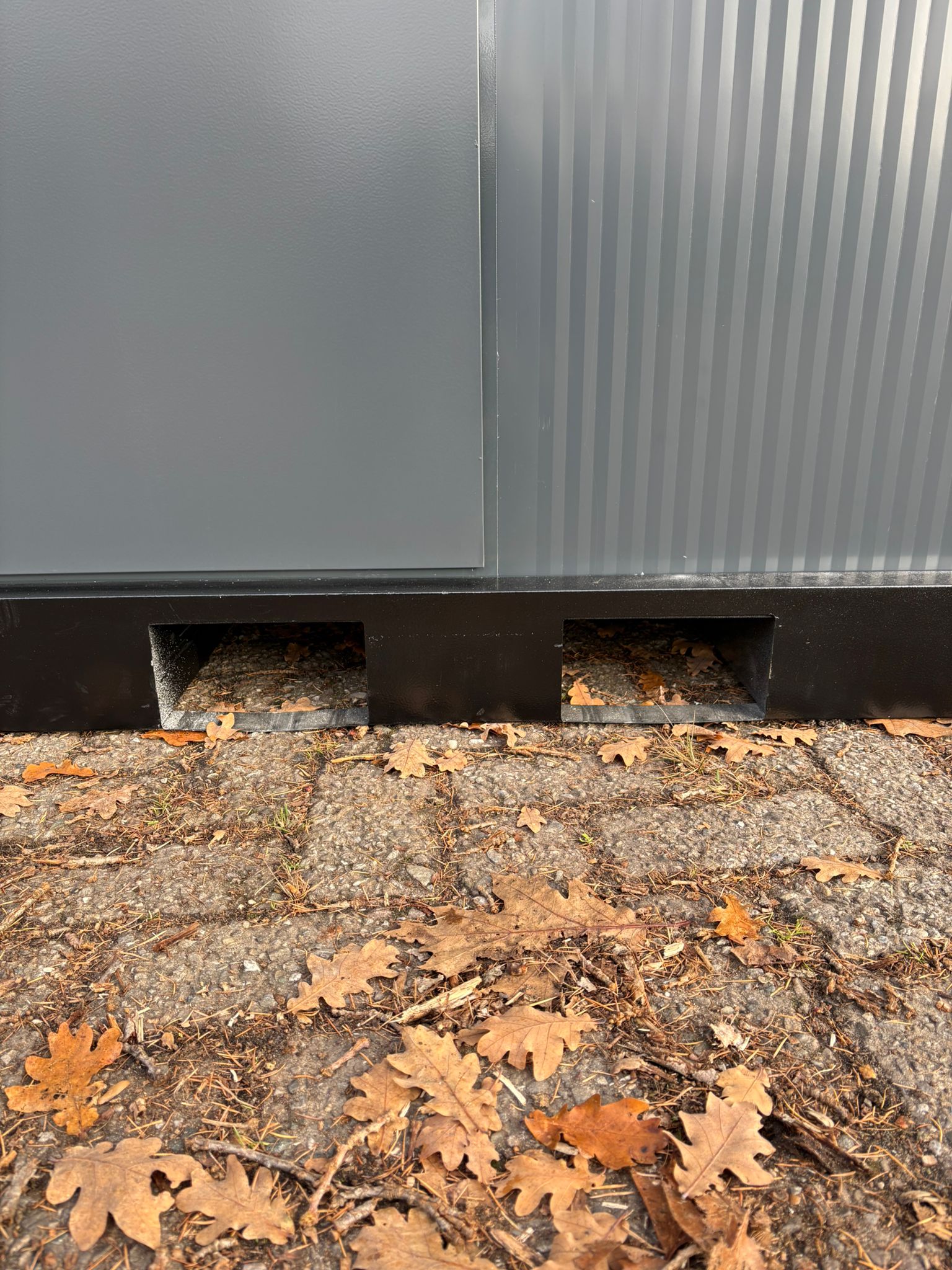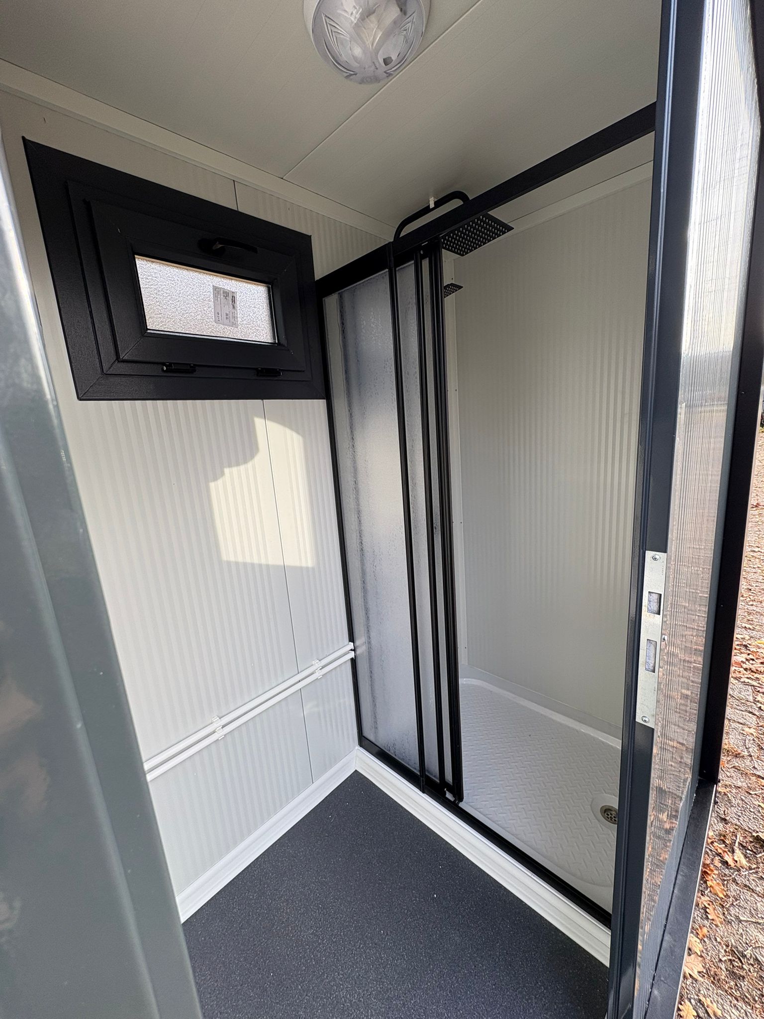 The unit is delivered complete and ready for immediate operation. It includes a rain shower with mixer tap, a separate changing area with hanging space a ceramic sink with black tap a mirror LED lighting and a ventilation window. The insulated construction ensures comfort while the non slip PVC floor is durable and easy to clean. Thanks to built in forklift pockets and lifting points placement on site is simple and efficient.