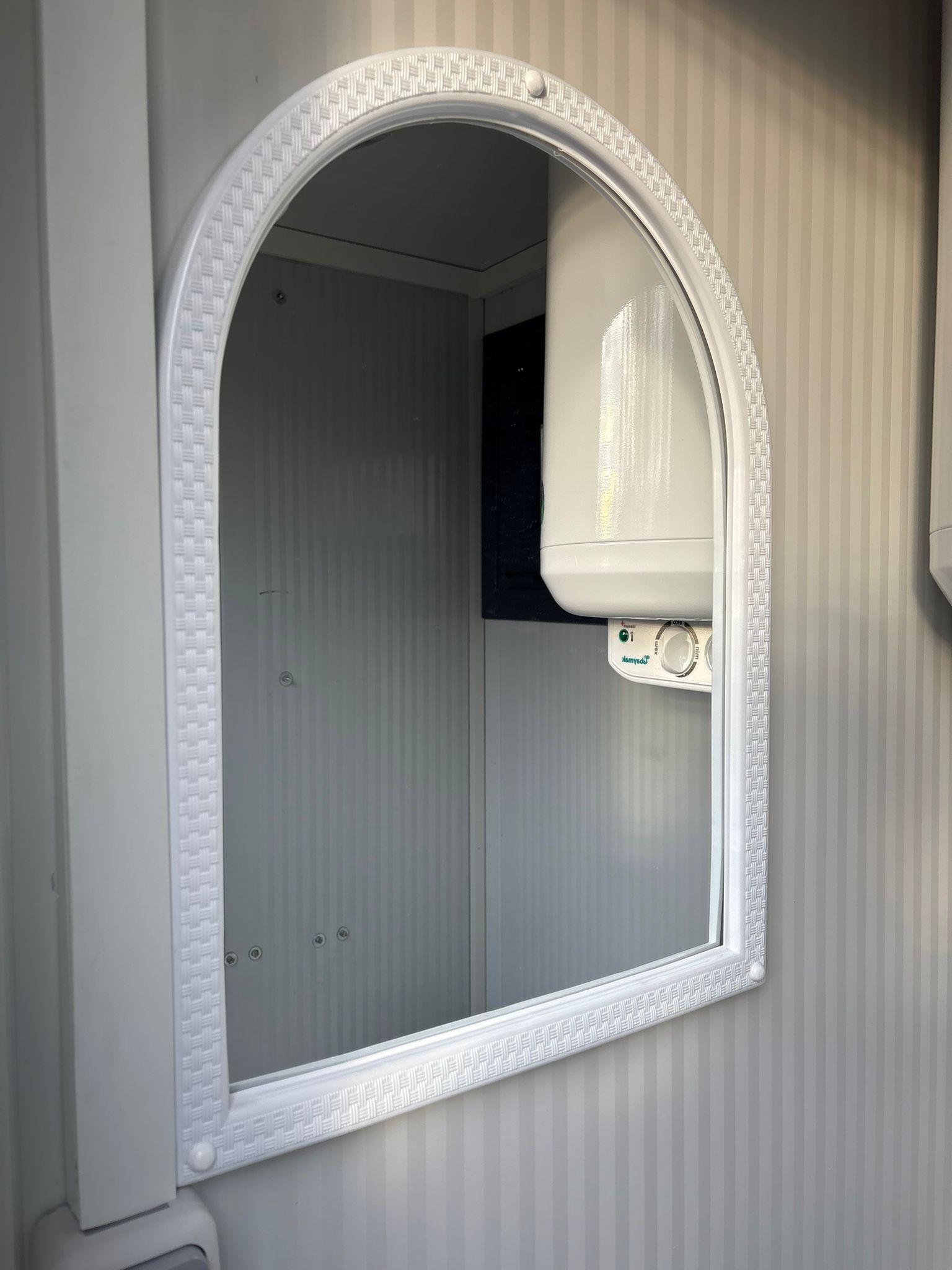 This prefab portable toilet and shower unit combines two separate rooms within one compact structure. One room is fitted with a ceramic toilet, sink, mirror, and toilet roll holder, while the other functions as a shower room with a tray, mixer tap, hose, and shower head. Fully insulated, ventilated, and equipped with LED lighting, it offers a hygienic and comfortable solution for everyday use. Delivered plug & play, the unit is quick to set up and requires minimal maintenance.